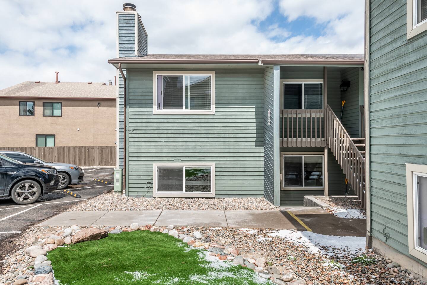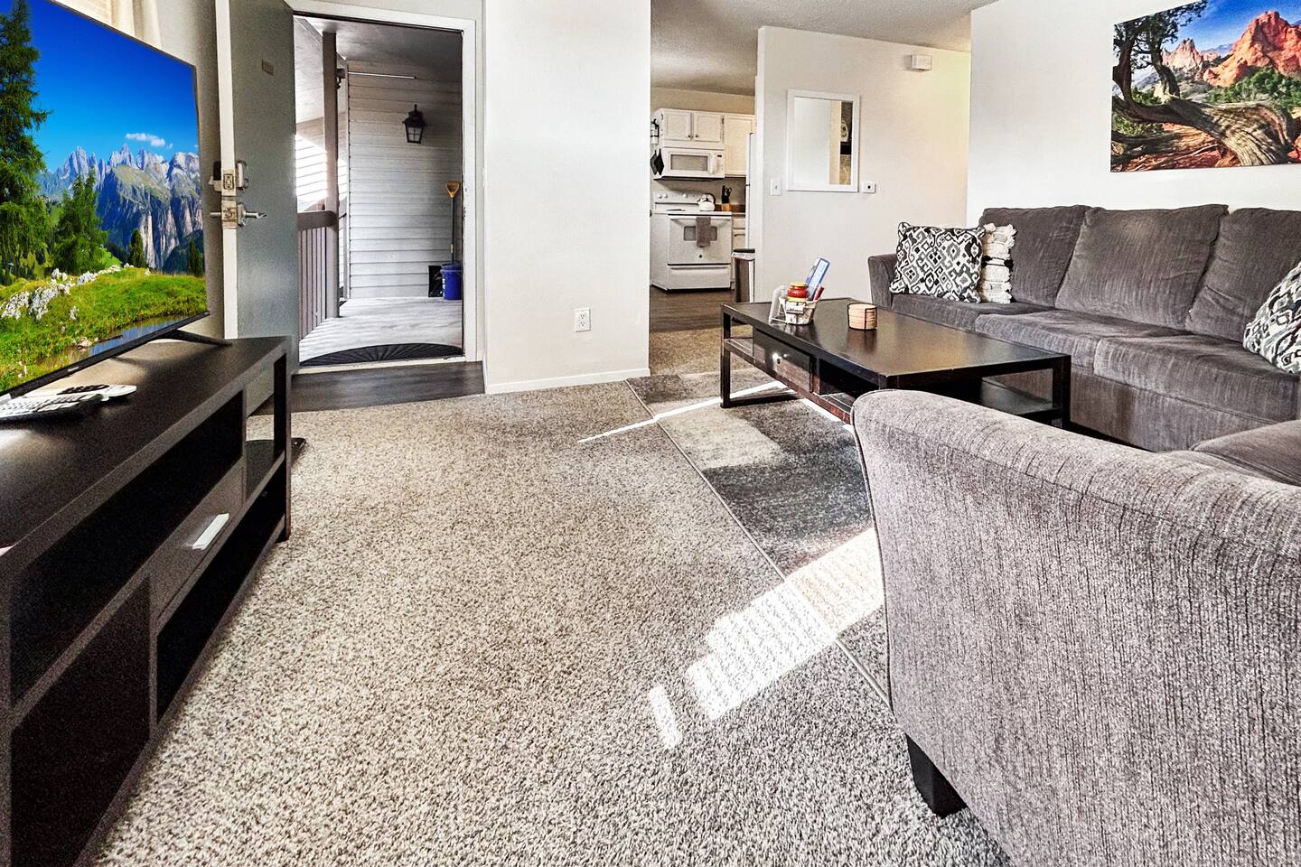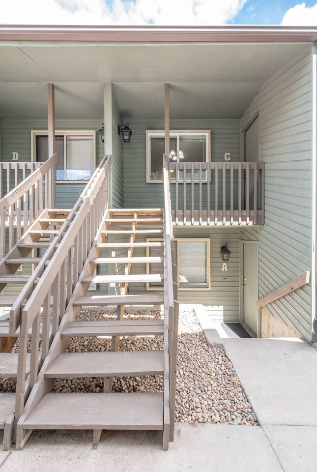 Discover a fully furnished condo with a complete kitchen featuring a full-size fridge, stove/oven, microwave, and dishwasher. The living room boasts a queen sofa bed, though note pull-out couches are most comfortable for younger children. Enjoy entertainment on a large SmartTV with YouTubeTV and DVR movies. WiFi is included. The Master Bedroom features a generously sized walk-in closet, thoughtfully stocked with amenities for families, including a Pack N Play, highchair, and a selection of toys for children. The spacious closet even offers enough room for an infant to comfortably sleep. This non-smoking property boasts ample free parking, a bathroom equipped with both a full shower and bathtub, and the convenience of an in-unit Washer & Dryer for exclusive use. Safety is paramount in the quiet neighborhood, and outdoor relaxation awaits on the shared patio with 2 BBQs. Situated in a fourplex, your unit on the upper level (11 steps) with easy access. Explore nearby eateries like Domino's Pizza, Subway, and Dunkin' Donuts, along with convenient services such as dry cleaners, a beauty shop, a small general store, and UPS—all within walking distance. Guests appreciate the prime location, noting its proximity to tourist attractions and easy access to the I25 freeway. Welcome to your ideal stay, combining comfort, convenience, and a great location.