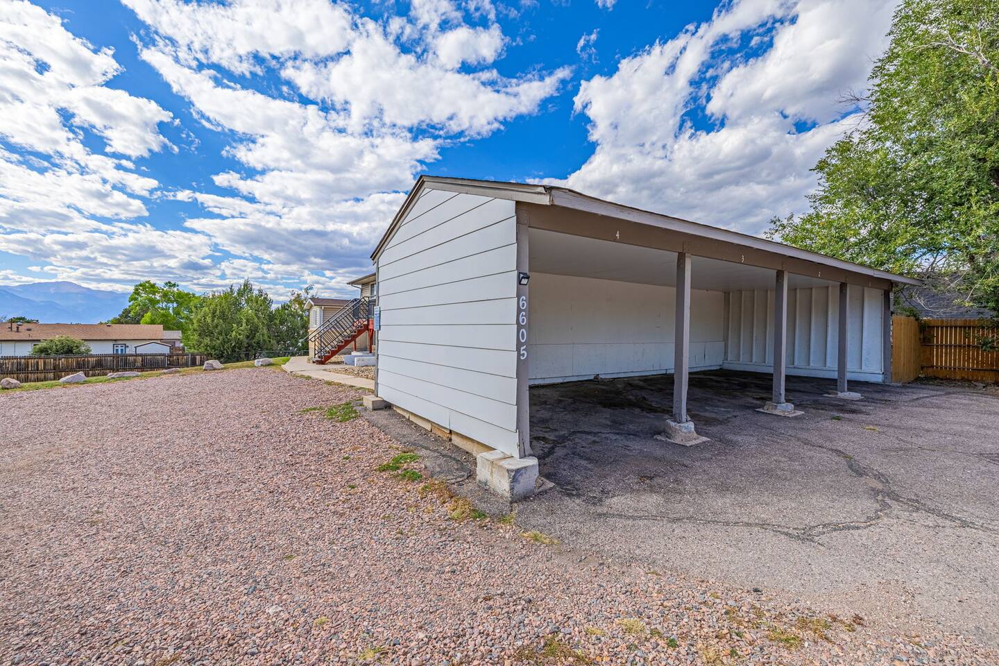 The main cross-streets are Powers & Palmer Park Blvd. The building is tucked away at the end of a quiet cul-de-sac with beautiful Pikes Peak views. The neighborhood is older and perfectly imperfect. There are dogs allowed in the two lower units (this is an upper unit).